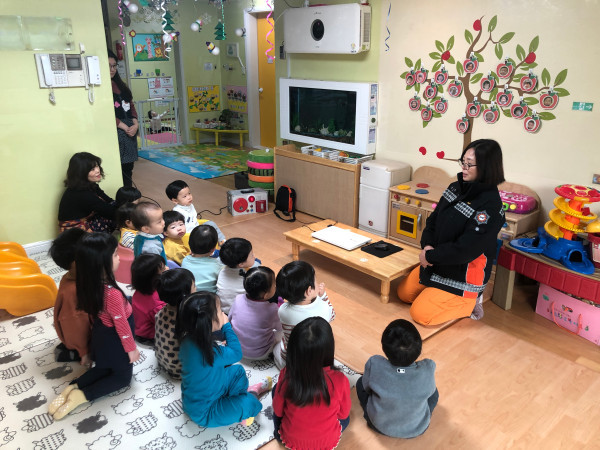 영등포소방서는 16일 오전 양평동에 위치한 늘푸른 어린이집 아이들과 교사들을 대상으로 눈높이 소방안전교육을 실시했다. 사진은 소방관이 어린이들에게 ▲소방관이 하는 일 ▲119신고요령 등에 대해 설명하는 모습. (사진제공=영등포소방서)