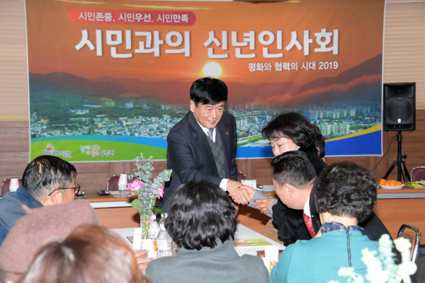 경기 동두천시 불현동 행정복지센터는 15일 오후 최용덕 시장과 이성수 시의회 의장, 불현동 사회단체장, 주민 등 50여명이 참석한 가운데 2019년도 시민과의 신년인사회를 성황리에 개최했다. 사진은 최 시장이 주민들과 악수를 하고 있는 모습. (사진제공=동두천시청)