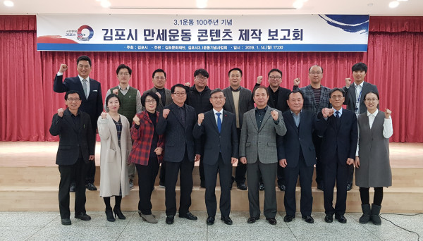경기 김포시는 김포문화재단, 김포시3.1운동기념사업회 관계자들이 참석한 가운데 지난 14일 시청 대회의실에서 '김포시 3.1운동 100주년 기념 콘텐츠 제작 보고회'를 개최했다. 사진은 정하영 시장 및 참여자들이 기념촬영을 하고 있는 모습. (사진제공=김포시청)