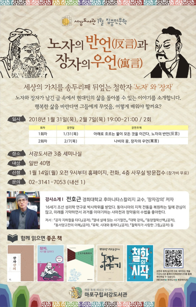 집중인문학 <노자의 반언(反言)과 장자의 우언(寓言)>은 1월 31일(목)과 2월 7일(목) 저녁 7시부터 9시까지 서강도서관 3층 세미나실에서 진행된다.