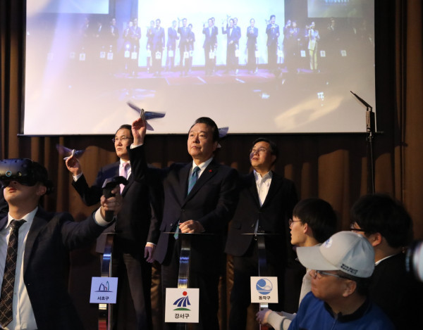 노현송 강서구청장은 16일 왕십리 디노체컨벤션에서 열린 혁신교육지구 2단계 협약식에 참석했다. 이날 박원순 서울시장, 조희연 교육감, 타 자치구 구청장들이 참석했다. 사진은 노현송 구청장이 비전선포식에서 플라잉버드를 날리는 모습. (사진제공=강서구청)
