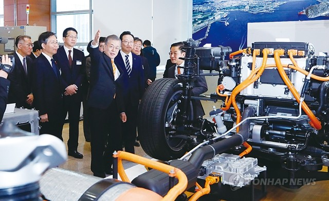 문재인 대통령이 17일 오전 울산시청 대회의실에서 열린 ‘수소 경제와 미래 에너지, 울산에서 시작됩니다’ 행사에 참석하기에 앞서 수소 활용 전시장을 둘러보고 있다. 문재인 대통령은 “수소경제를 위한 우리 정부의 의지는 확고하다. 우리로서는 국가 에너지 시스템을 근본적으로 바꾸면서 신성장동력을 마련할 수 있는 절호의 기회”라며 “수소경제는 에너지원을 석탄과 석유에서 수소로 바꾸는 산업구조의 혁명적 변화”라고 말했다.