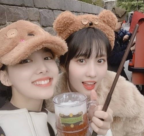 사진 속 모모와 나연은 곰돌이 머리띠를 쓰고 귀여움을 자아낸다. 두 사람은 화장기가 거의 없음에도 불구하고 청순한 미모를 자랑한다.