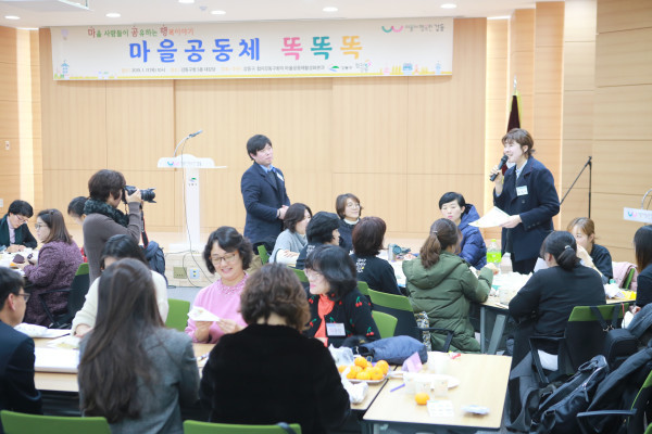 강동구(구청장 이정훈)가 17일 구청 5층 대강당에서 마을공동체 활동에 관심 있는 주민들과 함께 ‘강동구 마을공동체 똑! 똑 !똑!’ 행사를 개최했다. 사진은 행사에 참여한 주민들이 의견을 교환하고 있는 모습. (사진제공=강동구청)