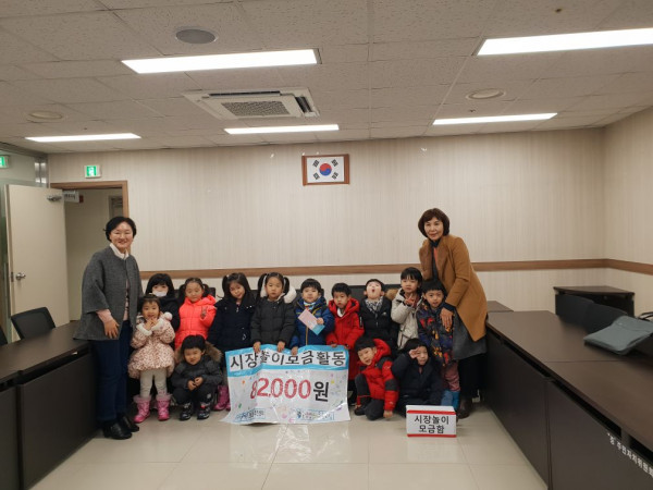 최근 동대문구 전농2동 주민센터가 삼성영재어린이집원생들과 원장으로부터 어린이집에서 진행된 ‘시장놀이’ 수익금을 사회복지공동모금회 따뜻한 겨울나기 사업에 전달해 달라며 기탁 받았다. 사진은 성금 기탁 후 기념촬영을 하고 있는 어린이집 원아들과 관계자의 모습. (사진제공=동대문구청)