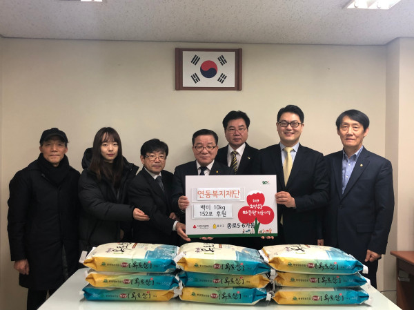 최근 서울 종로5·6가동은 최근 연동복지재단으로부터 설 명절을 앞두고 어려운 이웃에게 따뜻한 정을 나누기 위한 백미(10kg) 152포를 전달받았다. 이 백미는 지역내 저소득 가구에 전달될 예정이다. 사진은 백미 전달 후 기념촬영을 하고 있는 관계자들의 모습. (사진제공=종로구청)