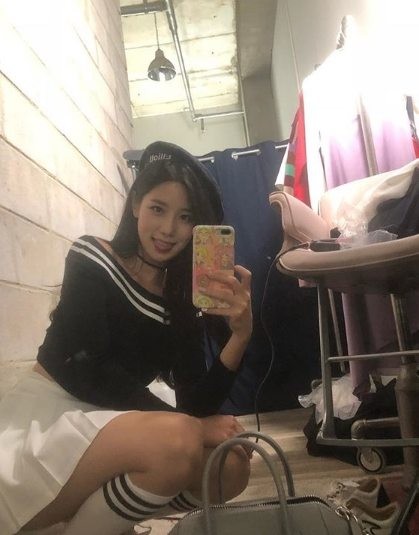 공개된 사진 속 조현은 스쿨룩 의상을 입고 거울 셀카를 촬영 하고 있다.