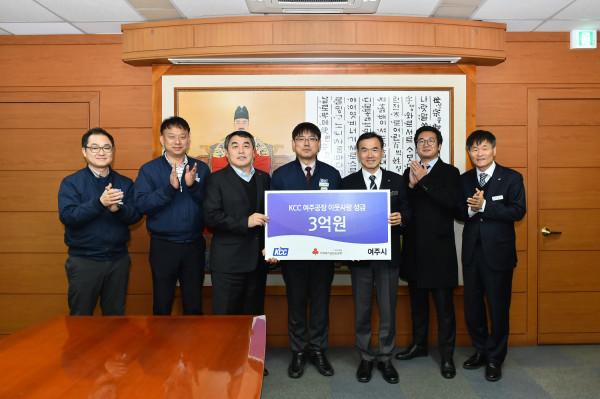 경기 여주시는 최근 (주)KCC 여주공장으로부터 불우이웃돕기 성금 3억원을 기탁받았다. 기탁된 성금 지역내 어려움을 겪고 있는 이웃들에게 전달될 예정이다. 사진은 이항진 시장(오른쪽에서 세번째)과 공장 관계자들이 기념촬영을 하는 모습. (사진제공=여주시청)