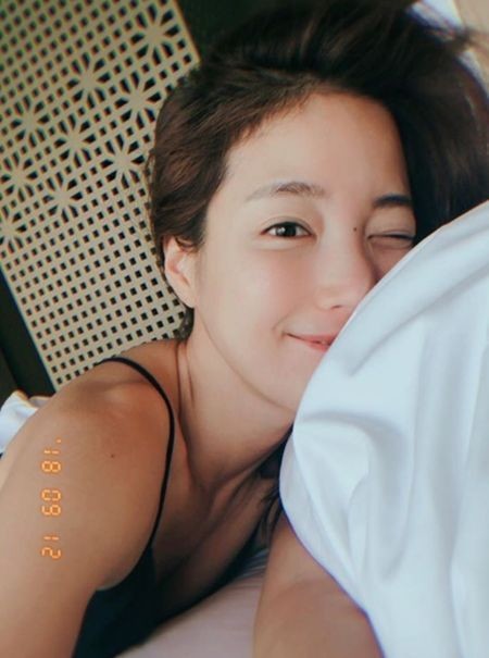 공개된 사진 속 기은세는 침대에 엎드린 기은세가 미소를 지으며 카메라를 향해 윙크를 하고 있다.