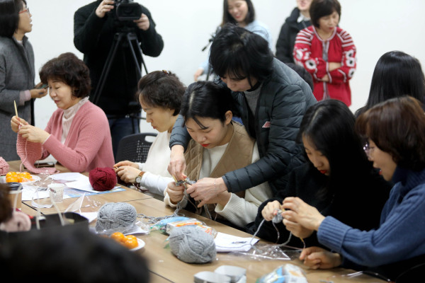 최근 서울 강남구 봉은사로 '강남구여성능력개발센터'에서 지역 소외계층을 위해 주민들이 직접 목도리를 떠 지역내 사회복지시설에 전달하는 ‘설맞이 따스미 목도리 뜨기’ 행사가 열렸다. 사진은 목도리를 뜨고 있는 주민들의 모습. (사진제공=강남구청)