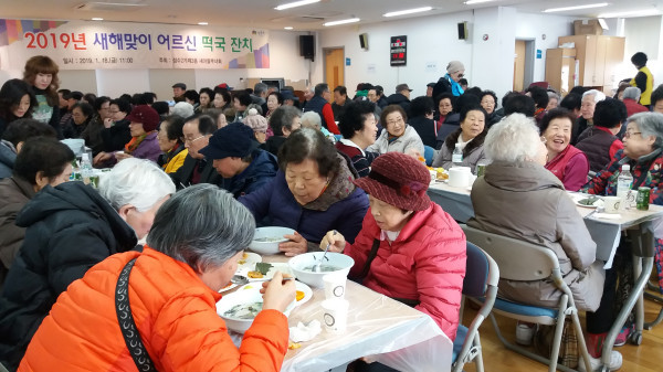 서울 성동구 성수2가제3동 새마을부녀회는 최근 ‘새해맞이 어르신 떡국잔치’를 개최했다. 이날 행사에서 지역내 노인들과 인근 경로당 노인 160명에게 떡국과 다과를 대접했다. 사진은 행사에 참석한 노인들이 떡국을 먹고 있는 모습. (사진제공=성동구청)