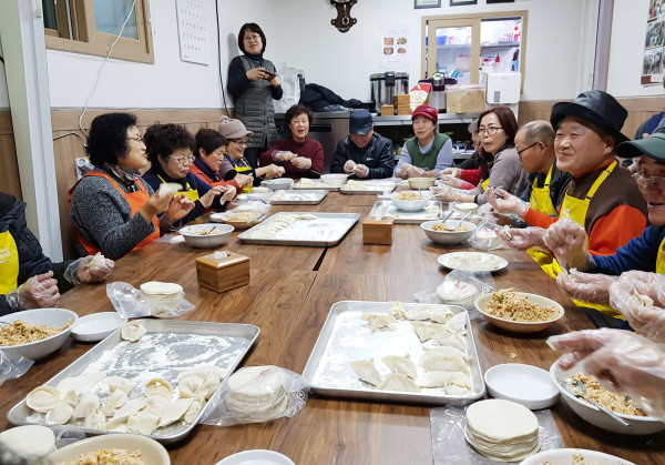도봉구 창2동 주민센터는 최근 창2동 주민협동조합 시끌벅적 사랑방 수랏간에서 홀몸노인들을 대상으로 ‘설맞이 식구데이’ 프로그램을 진행했다. 이날 함께 만두를 밪고 떡만둣국을 끓여 식사를 했다. 사진은 함께 만두를 빚는 모습. (사진제공=도봉구청)
