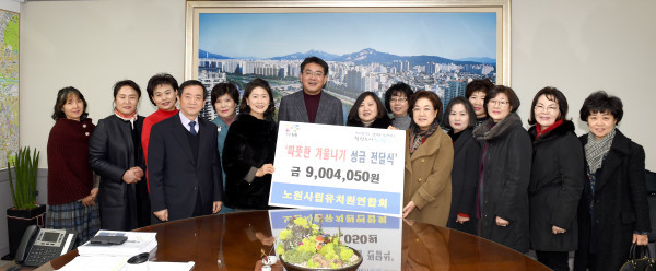 오승록 노원구청장은 지난 18일 구청장실에서 ‘노원구 사립유치원 연합회’ 임원진들을 만나 유아교육 현안에 대해 논의하고자 간담회를 개최했다. 이날 구 사립유치원 연합회는 주변의 어려운 이웃들에게 작은 도움을 주고자 54개 사립유치원생들이 1년간 모은 성금 900만4050원을 기부했다. 사진은 오 구청장과 연합회 관계자들이 기념촬영을 하는 모습. (사진제공=노원구청)