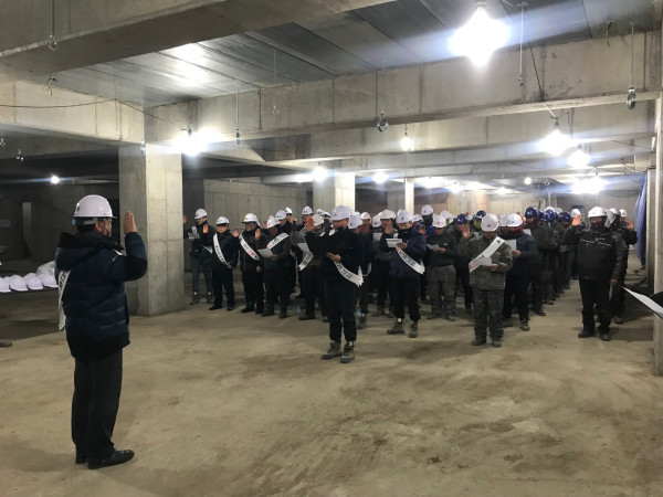 경기 동두천시 건축과는 지난 18일 생연동 소재 CGV 멀티플렉스 신축현장에서 ‘안전실천 결의대회’를 개최했다. 이날 행사에는 시 관계자, 시 건축사회, 현장관계자 등이 참석했다. 사진은 참여자들이 선서를 하는 모습. (사진제공=동두천시청)