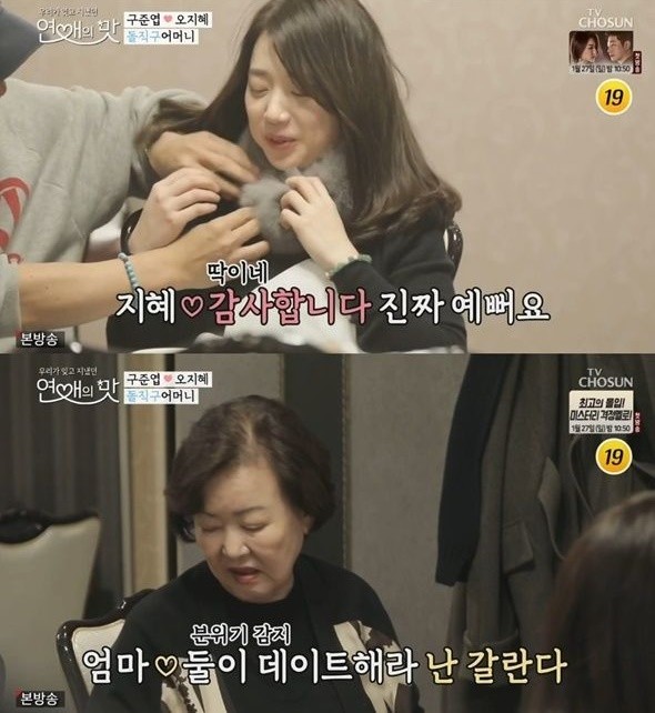 오지혜는 목도리에 만족하며 “감사합니다 진짜 예뻐요”라고 말을 했고 알콩달콩한 두 사람의 모습을 보던 구준엽의 어머니는 “너네 둘이 데이트해라 난 갈란다”라고 말하며 두 사람을 위해 빠져주는 센스를 발휘했다.