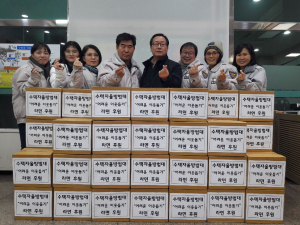 경기 구리시 수택1동은 21일 구리경찰서 수택자율방범대로부터 라면 50박스를 전달받았다. 이날 전달된 라면은 수택자율방범대 회원들이 명절을 앞두고 어려운 이웃을 위해 써달라며 전달한 것이다. 사진은 기념촬영을 하는 모습. (사진제공=구리시청)