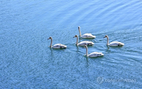 올해 울산시 태화강에 천연기념물 제201-2호 큰고니들이 4년 만에 찾아와 휴식을 취하고 있다.