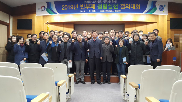 21일 경기 김포시상하수도사업소 전직원이 청렴한 조직문화 정착을 위한 ‘2019년 반부패 청렴실천 결의대회’를 개최했다. 사진은 결의대회에 참여한 김포시상하수도사업소 직원들이 기념촬영을 하고 있는 모습. (사진제공=김포시청)