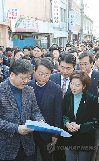 나경원 자유한국당 원내대표 등 한국당 원내지도부와 ‘손혜원 랜드 게이트 진상조사 태스크포스(TF)’ 위원장인 한선교 의원 등이 22일 전남 목포시 근대역사문화공간인 대의동 일대를 둘러보고 있다.