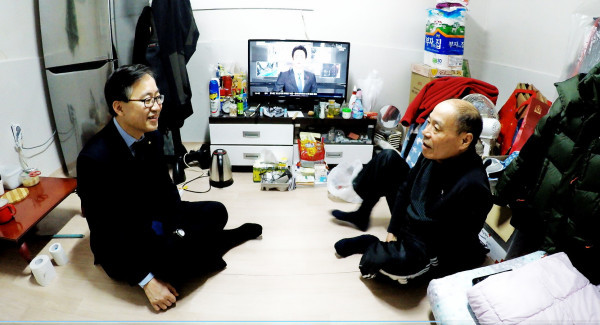 유성훈 서울 금천구청장이 오는 25일까지 직접 ▲홀몸노인 ▲1인 청·장년가구 ▲한부모가정 등의 소외계층을 찾아가는 현장 소통행정을 펼친다. 사진은 유 구청장(왼쪽)이 22일 홀몸노인을 위문해 고충 상담을 하는 모습. (사진제공=금천구청)