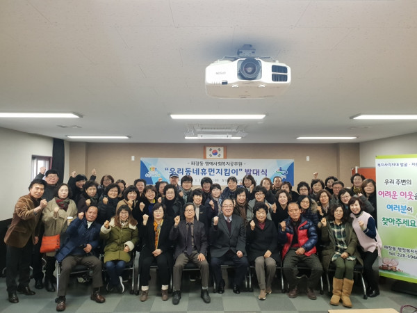 경기 수원시 장안구 파장동은 22일 행정복지센터에서 명예사회복지공무원 ‘우리동네휴먼지킴이’ 발대식을 개최하고 복지사각지대 해소를 위한 인적안전망 강화에 나섰다. 사진은 발대식에 참여한 관계자들이 기념촬영을 하는 모습. (사진제공=수원시청)