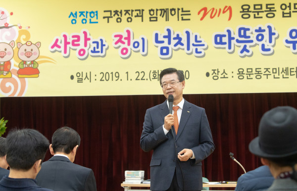 성장현 서울 용산구청장이 지난 22일 용문동 주민센터에서 주민 300여명과 함께 '2019 용문동업무보고회'에 참석해 주민들과 대화를 나눴다. 사진은 성 구청장(가운데)이 2019 용문동업무보고회에서 주민들과 대화를 나누고 있는 모습. (사진제공=용산구청)
