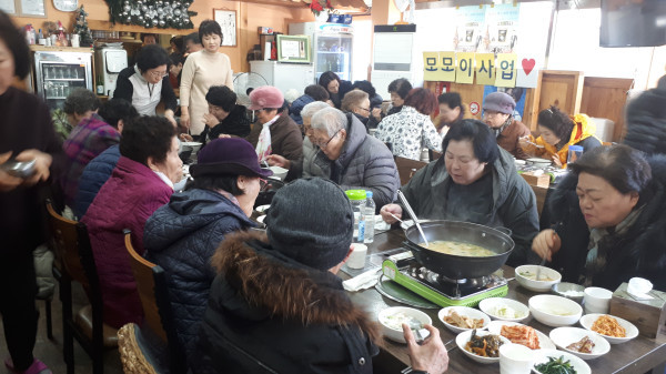 경기 수원시 영통구 매탄1동 지역사회보장협의체는 최근 지역내 식당에서 홀몸노인을 초청해 따뜻한 떡국을 대접했다. 사진은 이날 행사에 참여한 노인들이 떡국을 맛있게 먹고 있는 모습. (사진제공=수원시청)