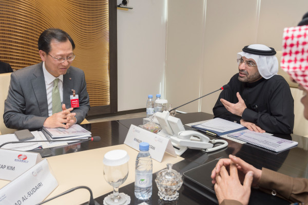 | ▲ 김종갑 한국전력 사장(왼쪽)과 알술탄 K.A.CARE 원장(오른쪽)이 양국 전력산업 경험 공유 및 전력신기술 협력을 위한 워크숍에서 대화하는 모습. | ||