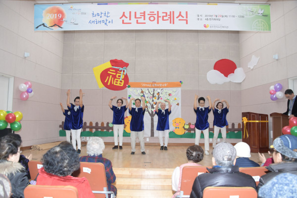 경기 동두천시노인복지관은 24일 노인복지관 한가족마당에서 새해맞이 신년하례식을 개최했다. 이날 하례식에는 최용덕 동두천시장을 비롯해 복지관 회원노인 등 행사관계자 약 300여명이 참석했다. 사진은 노인들이 축하 댄스 공연을 선보이는 모습. (사진제공=동두천시노인복지관)
