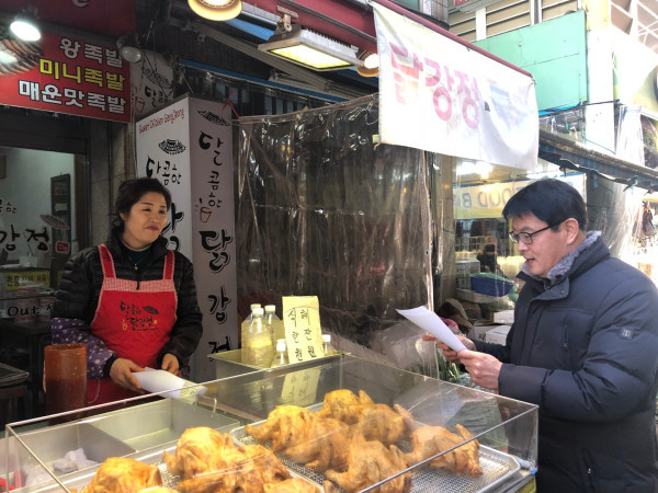 충남 아산시와 온양온천시장상인회는 최근 기업경제과 공무원, 전통시장 상인 20여명이 참여한 가운데 전통시장 화재예방 캠페인을 실시했다. 이날 화재예방 생활안전수칙 홍보물 배부 등의 활동을 실시했다. 사진은 화재예방 홍보물을 배부하는 모습. (사진제공=아산시청)