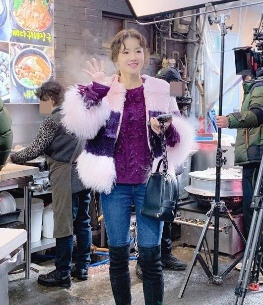 공개된 사진 속에는 이시영이 드라마 '왜그래 풍상씨' 촬영장에서 손을 흔들고 있는 모습이 담겨 있다. 보라색 니트에 롱부츠, 그리고 연보라 털이 달린 자켓까지 화려한 의상이 눈길을 끈다. 그럼에도 이시영은 더 수려한 비주얼로 완벽 소화해내 시선을 사로잡는다.