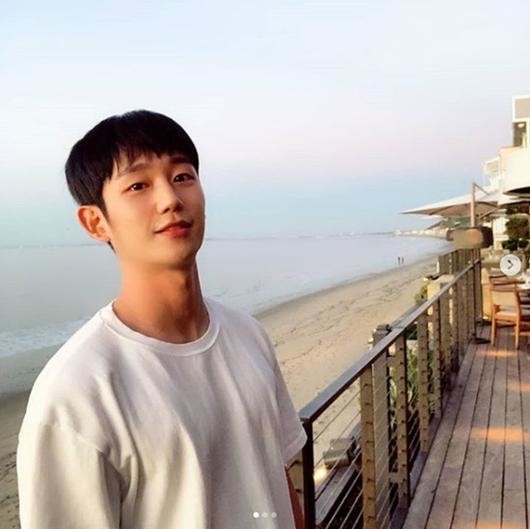 공개된 사진 속 정해인은 푸른 바다를 배경으로 카메라를 바라보며 미소 짓고 있다. 낮과 밤, 같은 장소에서 사진을 찍은 정해인은 훈훈한 분위기로 눈길을 사로잡는다.