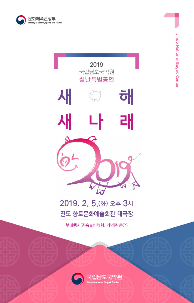 기해년 설날특별공연 <새해 새나래>는 공연과 함께 부대행사가 진행되는데, 공연 프로그램의 첫 순서는 하나 된 마음으로 새로운 세계를 꿈꾸는 <대동놀이>를 시작으로 기악합주로 듣는 <금강산타령, 동백타령>, 판소리 입체창 <흥보가> 중 ‘박 타는’ 대목, 창작춤 <부채춤>, 신명나는 민요 <남원산성, 성주풀이, 진도아리랑>로 구성되어 고향을 찾는 귀성객과 가족들의 마음을 넉넉하게 할 흥겨운 무대가 될 것이다.