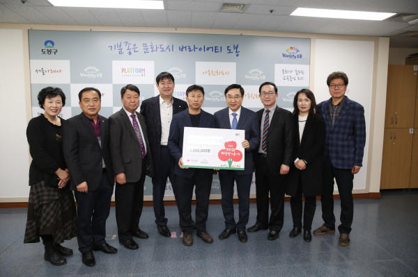 서울 도봉구는 최근 주민자치협의회 신규 임원진과의 간담회를 진행하고, 주민자치협의회로부터 지역의 어려운 이웃을 위한 ‘따뜻한 겨울나기 성금’ 100만원을 기탁받았다. 사진은 이동진 구청장(오른쪽에서 네번째)과 관계자들이 기념촬영을 하는 모습. (사진제공=도봉구청)