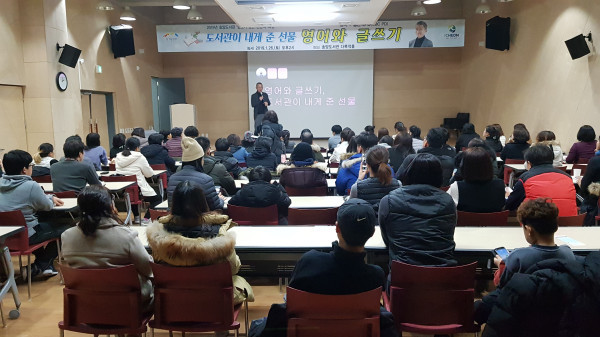 경기 이천효양도서관은 지난 26일 시민 100여명이 참여한 가운데 김민식 MBC PD의 ‘쉼표가 있는 인문학’ 초청 강연을 진행했다. 사진은 김 PD가 '도서관이 내게 준 선물, 영어와 글쓰기'를 주제로 강의를 진행하는 모습. (사진제공=이천효양도서관)