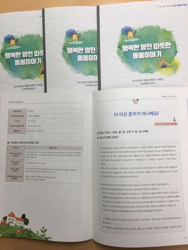 이번 사례집은 5번째 발간으로, 15가정의 이야기와 함께 복지 서비스 연계에 참고할 수 있는 양천구 자원목록을 담은 자원활용백서와 실전경험을 반영한 실천사례 팁도 수록했다.