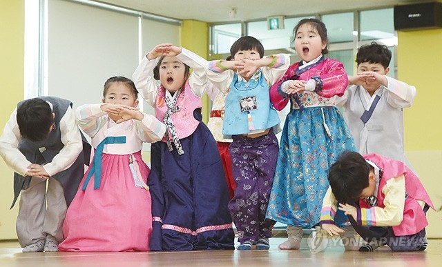 28일 경남 함양군 연꽃어린이집 원생들이 설 명절을 앞두고 전통 예절을 배우며 세배를 하고 있다.