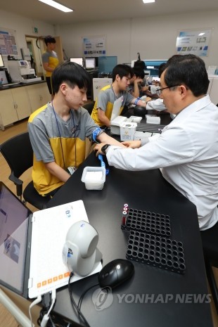 2019년도 첫 병역판정검사가 실시된 28일 오전 서울 영등포구 서울지방병무청에서 병역 의무자들이 채혈을 하고 있다.