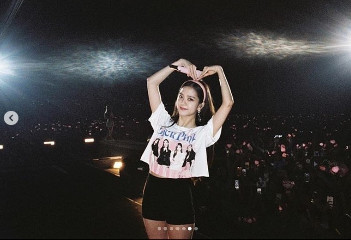 공개된 사진 속 지수는 무대 위에서 머리 위로 커다란 하트를 그리며 카메라를 응시하고 있다. 특히, 어두운 배경 속에서도 빛나는 지수의 여신 미모가 시선을 압도한다.