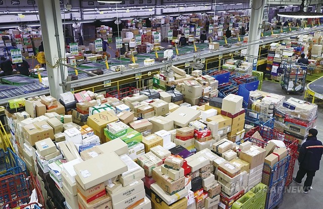 설을 앞둔 29일 오전 서울 광진구 동서울우편물류센터에서 직원들이 택배 우편물 분류 작업을 하고 있다. 우정사업본부는 오는 2월8일까지 특별소통 기간으로 정하고 정시 배달을 위해 3400여명의 인력과 3800여대의 차량을 추가 투입한다.