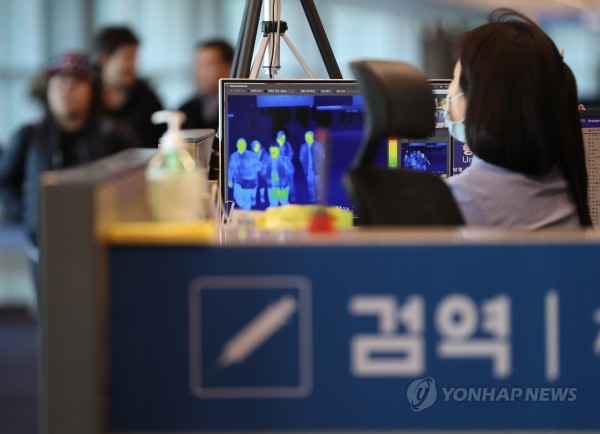 29일 오후 인천공항에서 입국객들이 체온을 측정하기 위한 열화상카메라 앞을 지나고 있다. 설 연휴를 앞두고 보건당국이 겨울철 식중독인 노로바이러스감염증과 독감(인플루엔자), 홍역 등 감염병에 대한 주의를 당부했다.
