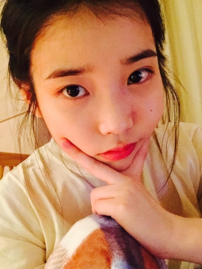 공개된 사진 속 아이유는 화장기가 거의 없는 민낯으로 브이를 하고 카메라를 응시하고 있다.
