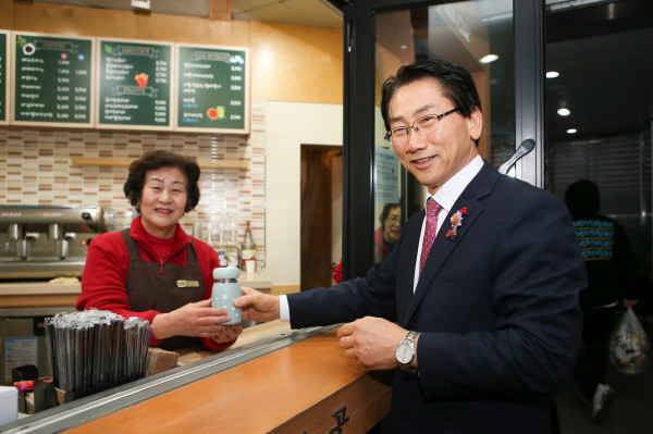 김영종 서울 종로구청장이 최근 ‘플라스틱 프리 챌린지’ 캠페인에 참여했다. 김 구청장은 플라스틱 프리 챌린지 캠페인에 김수영 양천구청장의 지목으로 참여하게 됐다. 사진은 김 구청장이 카페에서 개인컵을 이용해 커피를 구매하고 있는 모습. (사진제공=용산구청)