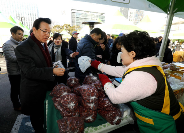정순균 강남구청장이 29일 구청 주차장에서 열린 ‘2019 강남구 설맞이 직거래장터’에 참석해 온누리상품권으로 농산품을 구매하고 있다. 이날 직거래장터에는 강남구 자매(우호)결연지와 농협중앙회의 추천으로 영주, 군산, 부여 등 전국 50여곳의 생산자가 참여해 한우·배·사과 등 명절 제수용품과 인삼·굴비 등 지역 특산물을 시중보다 5~30% 저렴하게 판매했다. (사진제공=강남구청)