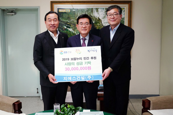 29일 서울 동대문구청 5층 구청장실에서 'GS건설(주) 불우이웃돕기 성금 기탁식'이 진행됐다. GS건설(주)은 동대문구 답십리제14구역 주택 재개발지역에 답십리 파크 자이의 완공과 지난 25일 입주를 기념해 3000만원을 구 사회복지협의회에 기부했다. 사진은 유덕열 구청장(가운데) 및 이용우 GS건설 상무, 김기태 GS건설 부장이 기념촬영을 하는 모습. (사진제공=동대문구청)