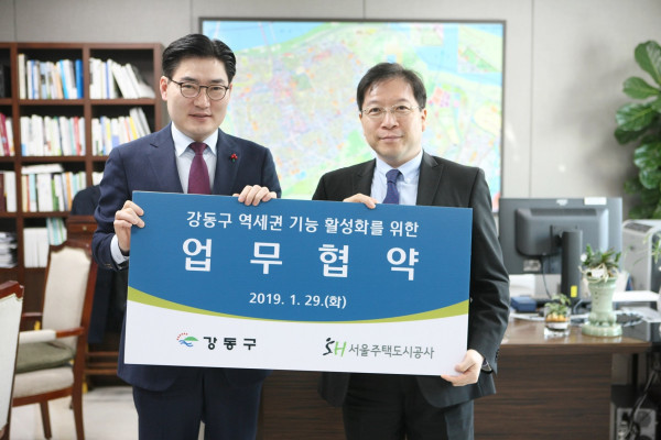 서울 강동구가 29일 민선7기 공약사항인 ‘주요 역세권의 합리적 개발’ 이행을 위해 이정훈 구청장과 서울주택도시공사 김세용 사장 등이 참석한 가운데 업무협약을 체결했다. 사진은 이 구청장(왼쪽)과 김 사장이 기념촬영을 하는 모습. (사진제공=강동구청)