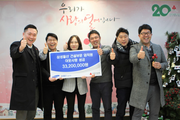29일 사회복지공동모금회는 삼성물산 건설부문 노사협의회로부터 어려운 이웃을 위해 사용해 달라며 성금 3320만원을 전달받았다. 사진은 성금을 전달한 삼성물산 임직원들이 웃는 얼굴로 포즈를 취하며 기념촬영을 하고 있는 모습. (사진제공=사랑의열매)