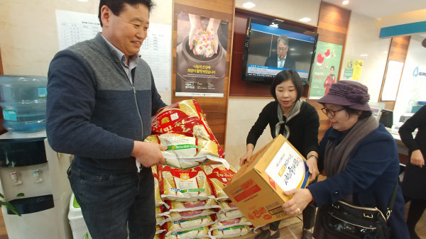 경기 수원시 팔달구 화서2동은 지난 28일 서수원새마을금고 화서지점에서 사랑의 좀도리 운동의 모금품인 쌀 20kg 39포와 라면 39박스를 지역내 기초생활수급자 및 홀몸노인 등 39가구에 전달했다. 사진은 관계자가 노인에게 쌀을 전달하는 모습. (사진제공=수원시청)