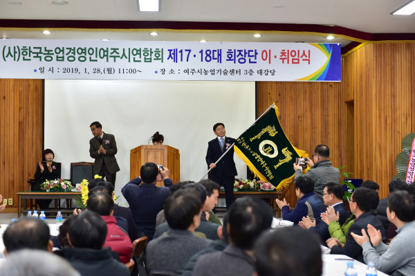 (사)한국농업경영인 경기 여주시 연합회장 이·취임식이 최근 농업기술센터 대회의실에서 진행됐다. 이날 행사에는 이항진 시장, 정병국 국회의원 등이 참여해 이·취임하는 회장에게 축하와 격려를 전했다. 사진은 이·취임식이 진행되는 모습. (사진제공=여주시청)