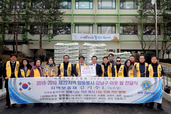 서울 강남구가 30일 ‘2019 설맞이 사랑의 쌀 전달식’에서 국제라이온스협회, 그룹 세븐틴, 구구단, 국카스텐으로부터 쌀 총 1만2570kg을 전달 받았다. 사진은 정순균 구청장(왼쪽에서 일곱번째)과 관계자들이 기념촬영을 하는 모습. (사진제공=강남구청)